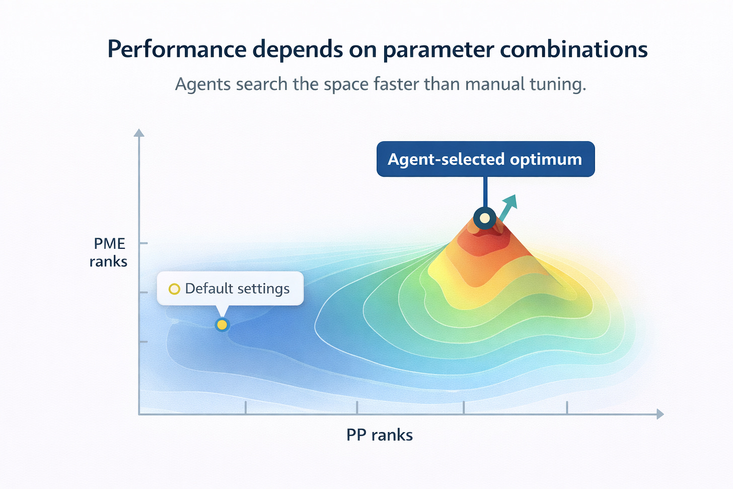 Figure: AI-driven parameter optimization outperforms default GROMACS settings by searching the full PP/PME configuration space.