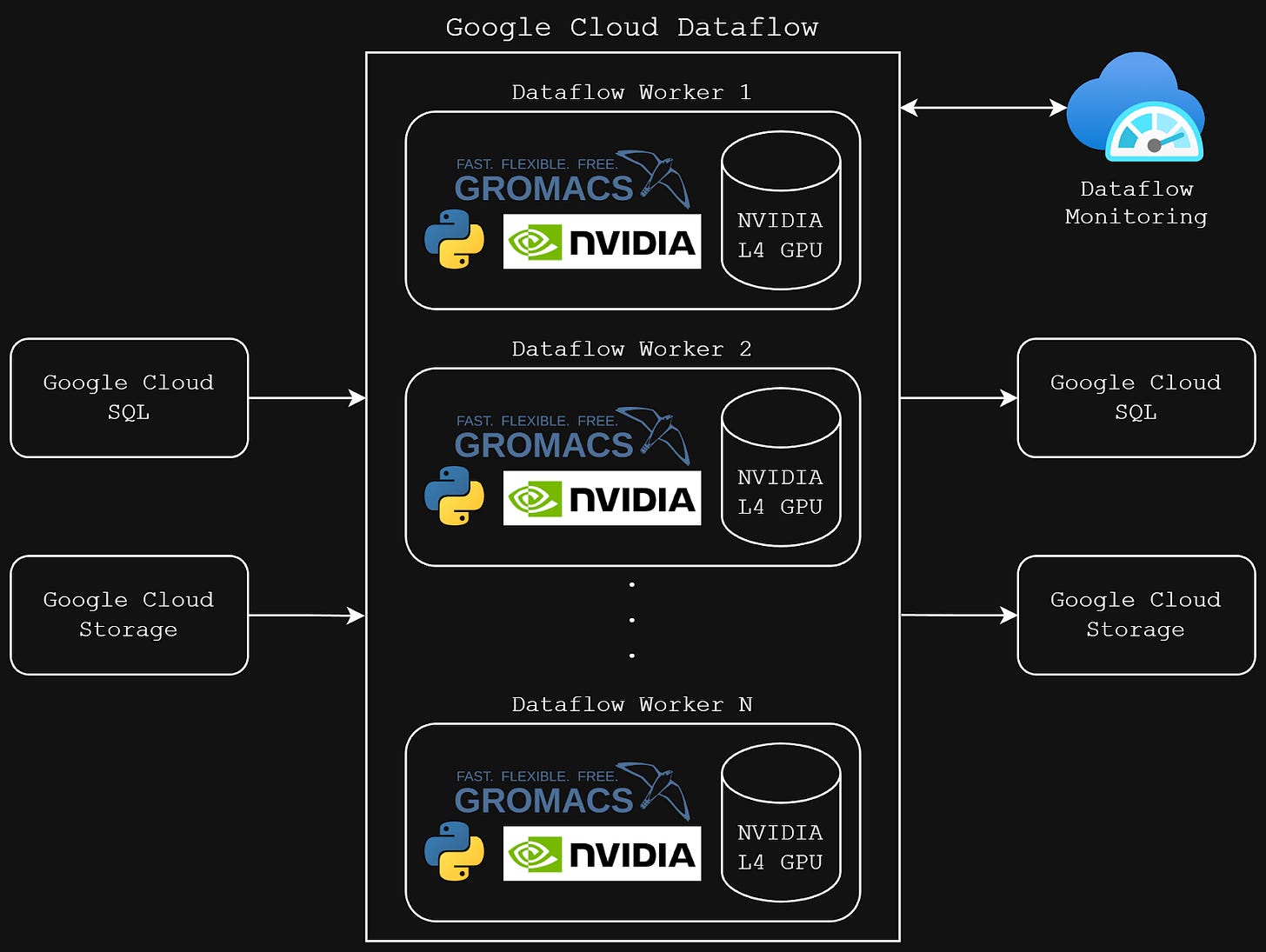 Our GROMACS pipeline architecture on Google Cloud Dataflow with NVIDIA L4 GPU workers